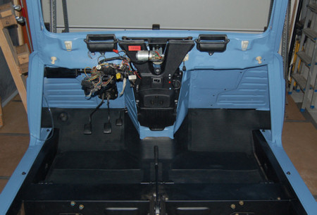 I was able to complete the fuel tank with it's filler and breather hose and cap, mount the taillights (with grommets in a very very sad condtion :(), lay the wiring, and attach some of the inner parts as the steering column, the radiator, wiper-motor, and the brake-, clutch-, and throttle-pedal.