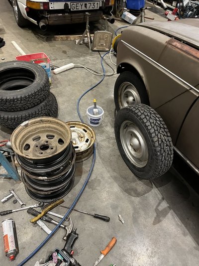 The GreenOne was prepared with jars containing oil, coolant, petrol and coffe for the driver, as always my tool kit and drive belts to waterpump in the trunk. And for pick up i brought a pallet worn R4 tyre, a box ratchet straps, some fiber cloth and plastic to cover engine from dirt and debree.