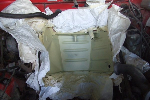In the meantime, I've started some work on the body. The area behind the engine was quite rusty, so I've sanded it smooth and applied a rust killer, then sprayed 2 coats of primer