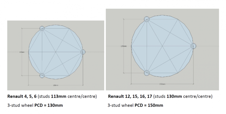 That's not how you measure the distance 3 by 130 is PCD which is pitch circle diameter I have had this discussion many times previously much harder to measure on a 3 stud wheel if you find somebody with a Renault 4 wheel to measure the distance between the studs it will be less than what you've got there right now I can't go outside and find one to measure for you