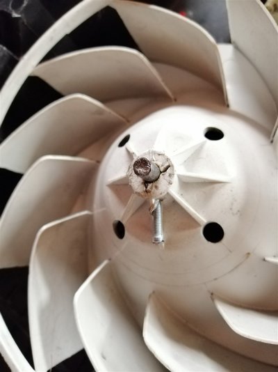 First, plastic ventilator body was slipping at vent engine shaft. Security washer did not hold body on shaft.