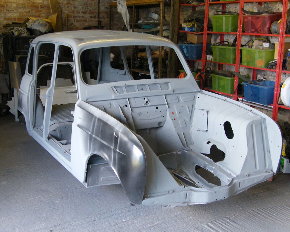 The body took twice as long to shotblast - 3 days to blast and paint. Here is is in bare metal. It's sitting on a slave GTL chassis so I can move it in and out of the garage single handed (in case it rains when there's nobody else around).