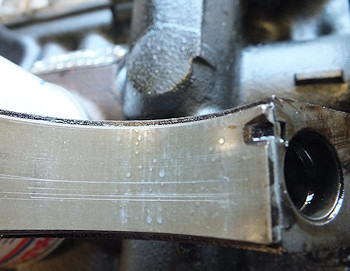 I finally got around to pulling the engine apart at the end of January 2012. The crankshaft seems OK but the bearings have weird bubbles on them that are rough to the touch. I guess this is a result of water separating from the oil and corroding the bearings.
