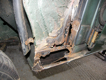 This car was saved by a very thick coat of sealant which remained in place after the metal had disappeared and stopped mud from getting into the sill.