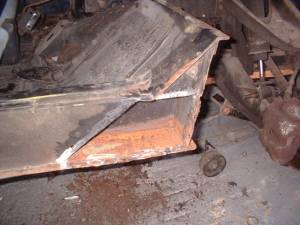 The original reinforcement was rotten and had to be remade. The reinforcement consisted of two U shaped pieces of metal. The outer piece is triangular in shape and spreads the suspension loads into the chassis. The inner reinforcement is much smaller and braces the two forward bolt holes.
