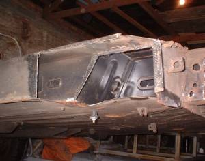 The rust was relatively localised. This photograph shows the LHS rear corner of the chassis with all rusty metal removed. Each side of the chassis member was cut back to a different point and angled. This is to reduce the chance of stress build up causing fatigue along the welding line.